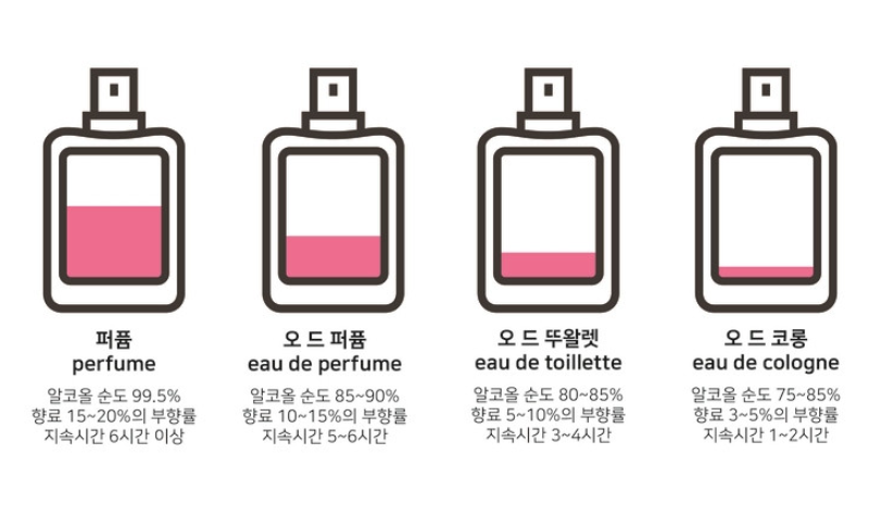 위 사진에서 '오 드 코롱'에서 '퍼퓸'으로 갈수록 향이 진해지며, 지속시간이 길어집니다!